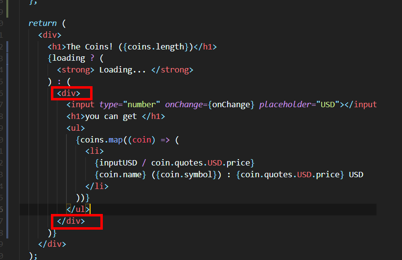 반환하는 태그는 상위 부모태그 1개로 제한된다. 즉 묶어주어야 한다. 아래의 경우에는 div 태그로 input, h1, ul 태그들을 묶어주었다.