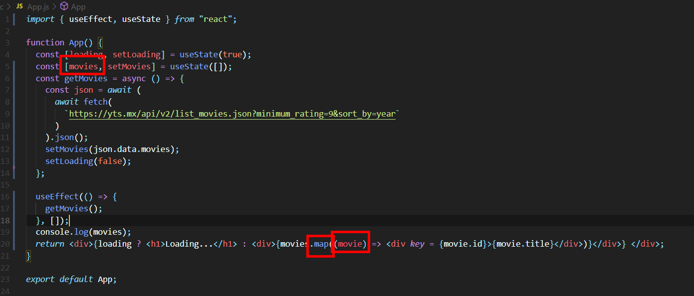 (보통 map 을 쓰게 되면 배열로 부터 전달받을 각각의 item 에 대해 자유롭게 인자명을 정해줄 수 있는데 state 에서 movies 라고 선언했으면 단수형으로 movie 로 주는 것이 일반적이다.)