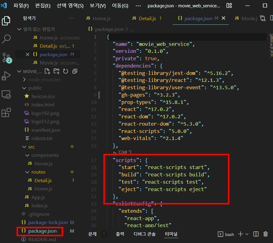 그리고 나서 해줘야 하는 것이. package.json 에 가서 제일 밑에,