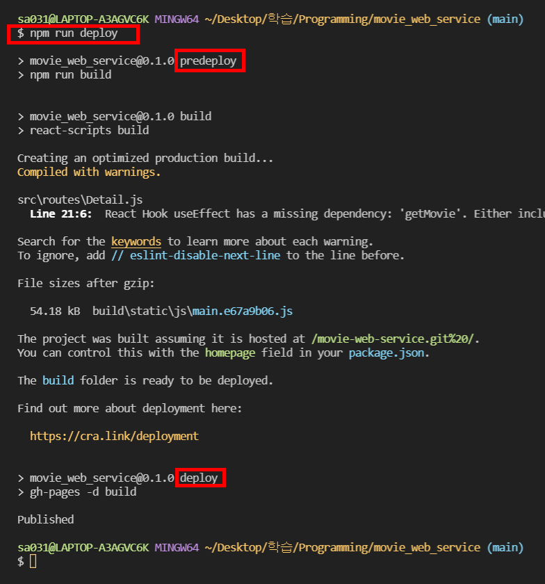 predeploy 라는 명령어를 생성해주어 내가 deploy 라는 명령어를 실행시켜주면 predeploy 라는 명령어가 먼저 실행되고 predeploy는 npm run build를 실행시킨다.