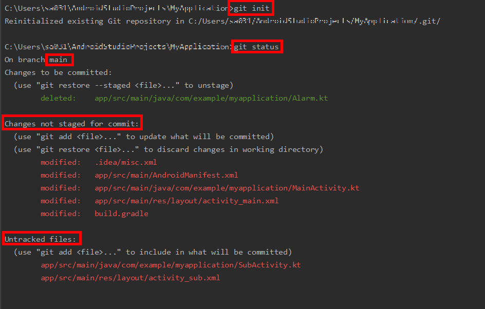 git status 명령어로 git 저장소가 잘 초기화되어 생성되었는지 확인해 줍니다.