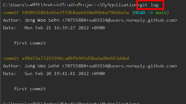git log 명령어로 커밋 로그들을 확인 할 수 있습니다.