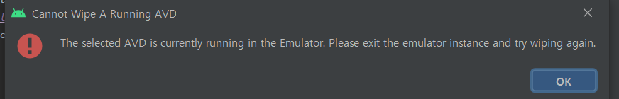The selected AVD is currently running in the Emulator. Please exit the emulator instance and try wiping again.
