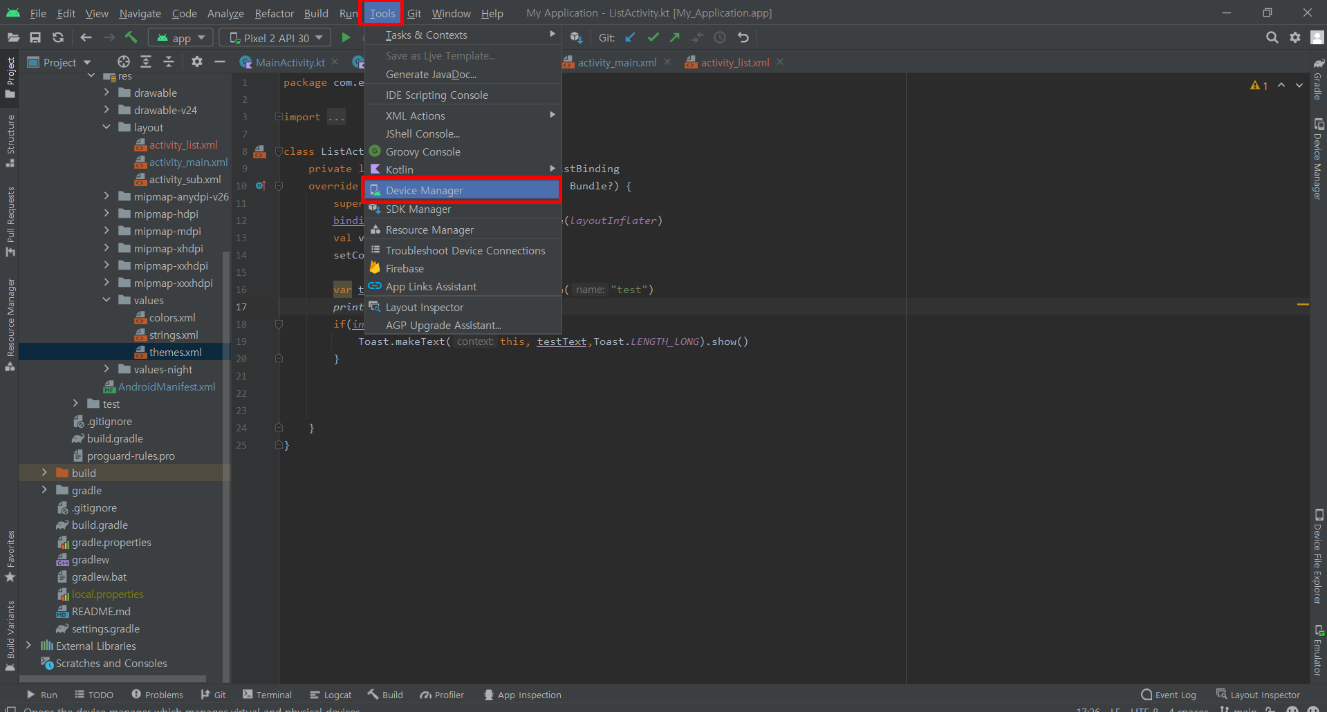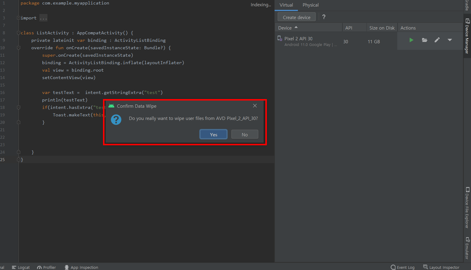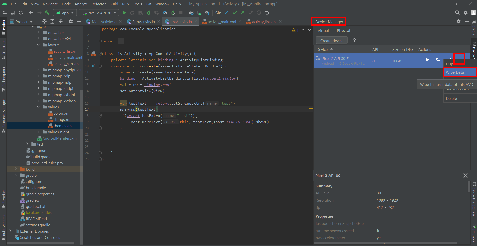 코드는 제대로 작성하였으나 갑자기 애뮬레이터 상에서 토스트 메시지가 뜨지 않을때 다음과 같이 수행하면 문제가 해결 되었음 AVD Manager -> 가상머신 선택 -> WipeData 를 클릭 www.youtube.com/watch?v=ZK