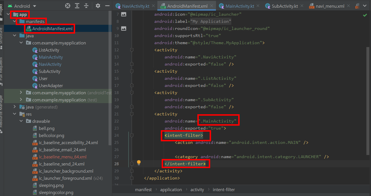activity 태그 안에 intent-filter 가 적용되어 있는 것이 바로 첫 화면에 뜨는 액티비티이다.