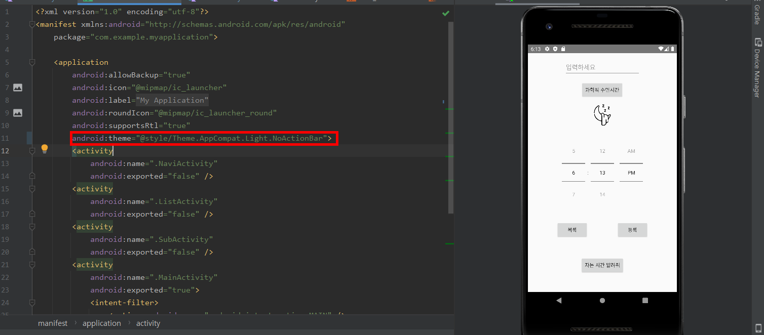 app/manifest/AndroidManifest.xml 에서 android:theme="" 의 값을 변경해주면 된다.