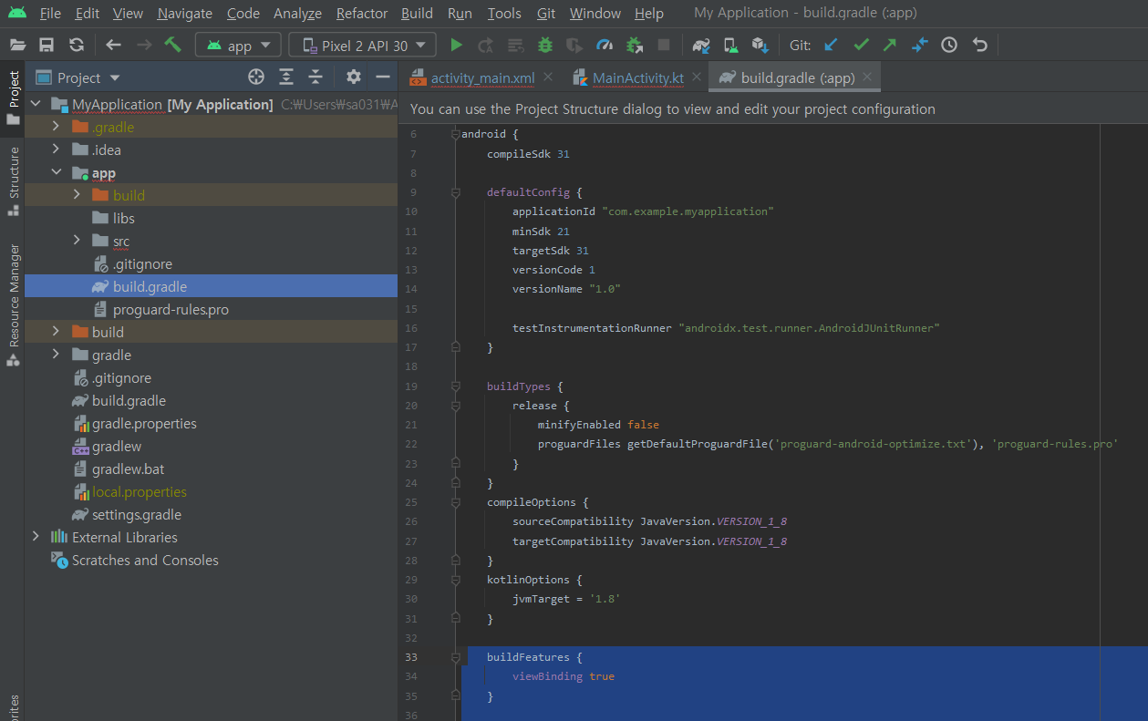 2. binding을 통해 xml(레이아웃) 파일의 View 들(TextView,Button 등) 을 조작할 Activity 파일에 다음 코드 입력