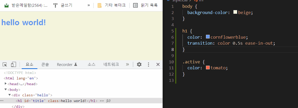 CSS의 transition 갑을 주어 부드러운 색 전환을 할 수도 있다.
