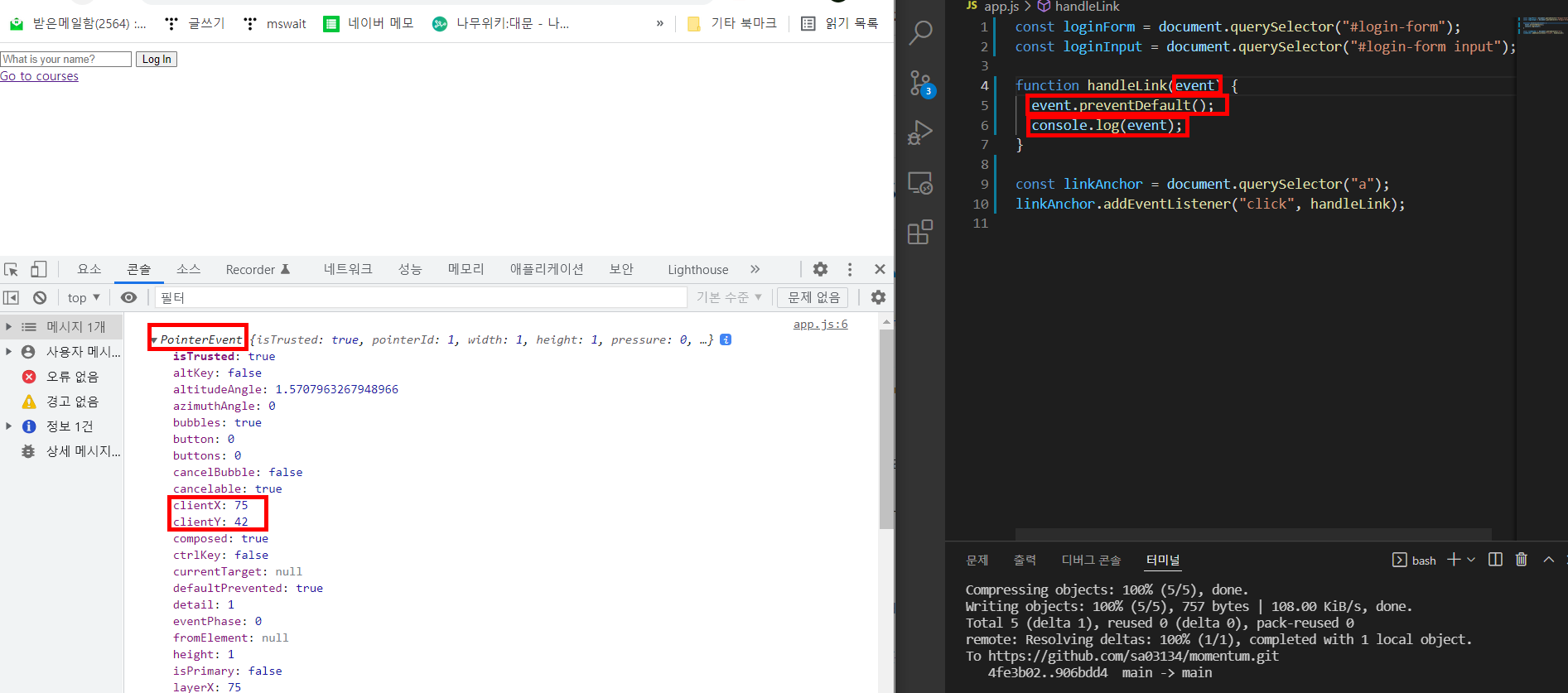 event.preventDefault() 함수로 인해 <a>의 링크를 아무리 클릭 하여도 연결된 페이지로 이동하지를 않는다. 왜냐하면 이게 기본동작을 막고 있기 때문이다. brower는 default로 link를 클릭시 이동하도록 되어있는데 이를 막고 있는 것이다.