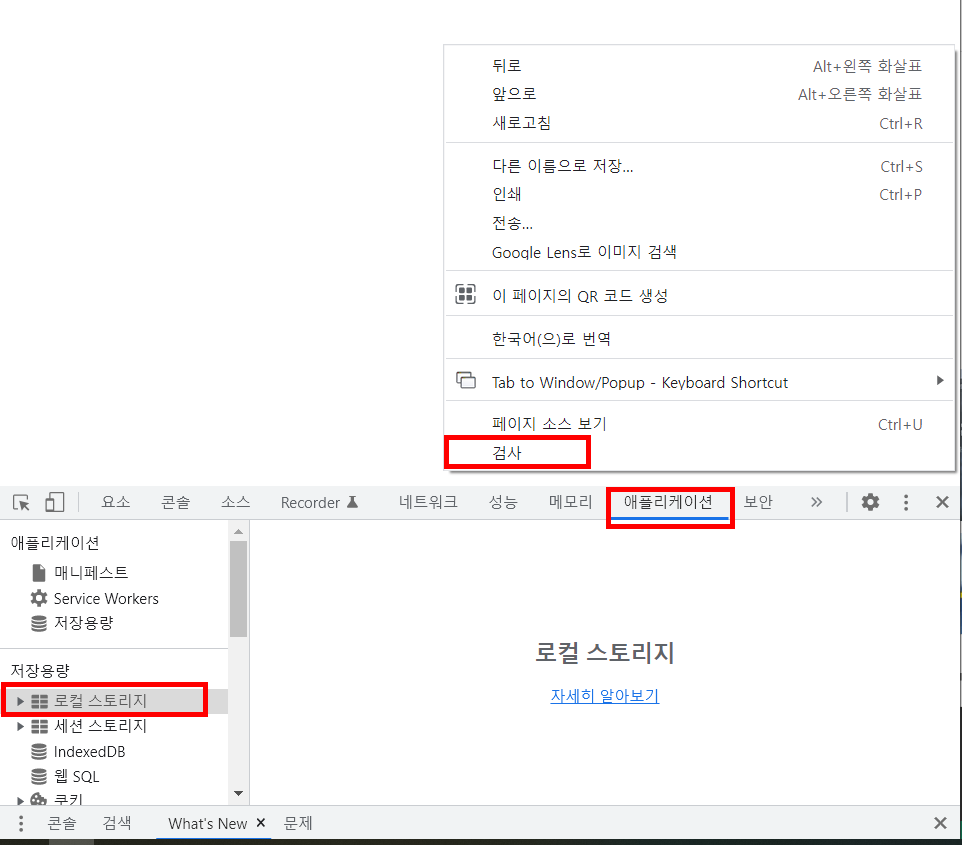 아래와 같이 마우스 오른쪽 클릭 > 검사 > 애플리케이션 탭 > 로컬 스토리지 를 볼 수도 있다.