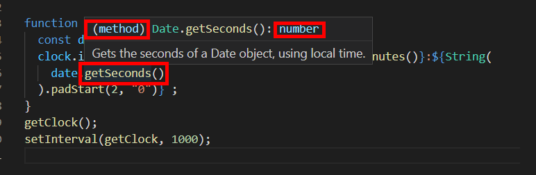 getSeconds() 함수에 커서를 올리고 설명을 보니 반환하는 값의 형태가 number 임을 알 수 있었다.