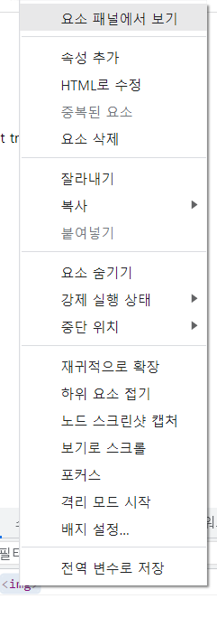 실행을 시켜보면 콘솔창에 img 태그가 보이는데 오른쪽 마우스 클릭 하고 최상단의 '요소 패널에서 보기' 를 클릭해보면