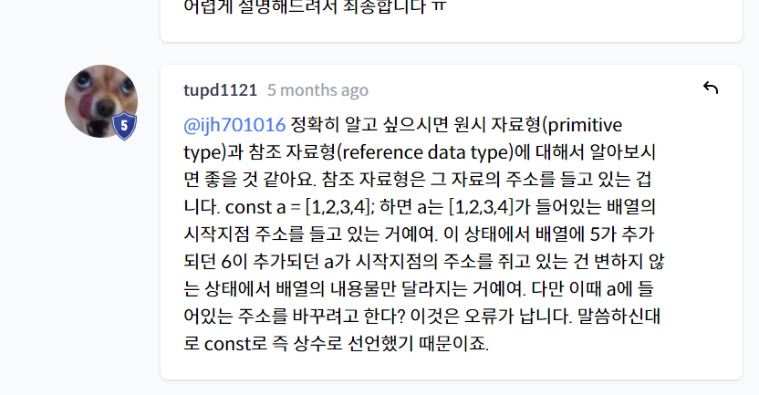 참조 자료형은 그 자료의 주소를 들고 있는 것이다. const a = [1,2,3,4]; 하면 a는 [1,2,3,4]가 들어있는 배열의 시작지점 주소를 들고 있는 거예여. 이 상태에서 배열에 5가 추가 되던 6이 추가되던 a가 시작지점의 주소를 쥐고 있는 건 변하지 않는 상태에서 배열의 내용물만 달라지는 거예여. 다만 이때 a에 들어있는 주소를 바꾸려고 한다? 이것은 오류가 납니다. 말씀하신대로 const로 즉 상수로 선언했기 때문이죠.