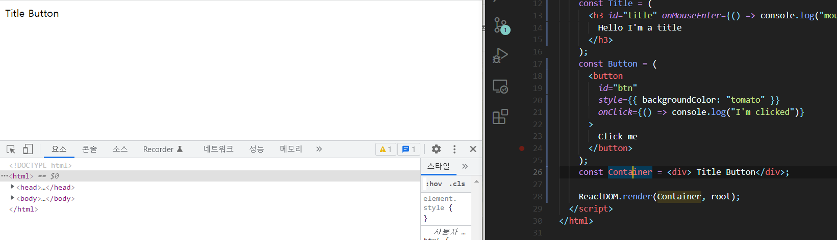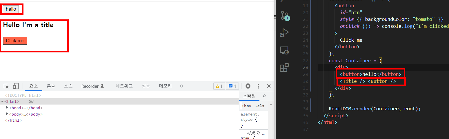 <button> : react 와 JS는 HTML 태그라고 생각한다.<Button> : react 와 JS는 컴포넌트로 인식한다.